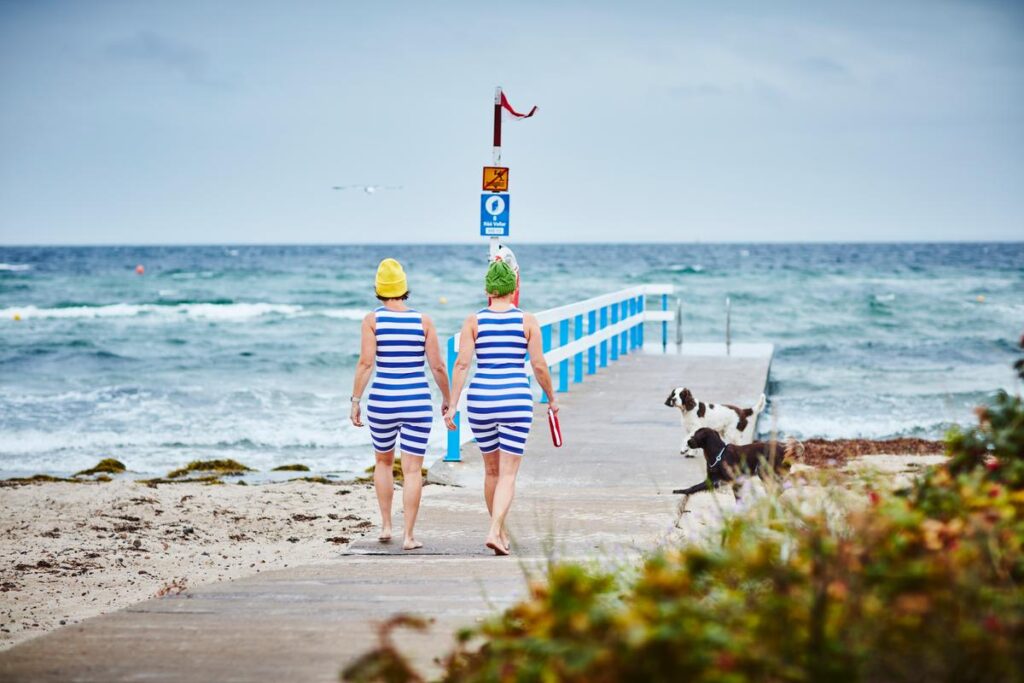 Tina och Marie har fortsatt traditionen att bada tillsammans och har numera även matchande badrockar och värmande plagg. Oftast kallbadar de vid badtratten ute på piren i Råå, men ibland föredrar de att gå ner nära stranden för ett lite mildare, uppfriskande dopp.
